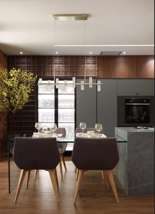 A iluminação ambiente, ou decorativa, é usada para criar uma atmosfera acolhedora e destacar elementos arquitetônicos ou de design. Pendentes sobre a ilha ou a bancada de refeições, por exemplo, podem adicionar um charme extra e uma iluminação suave que complementa a iluminação geral e de tarefa.
