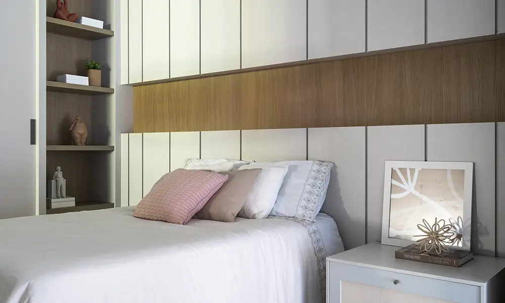 - Em dormitórios de casal, tons neutros, texturas suaves e padrões discretos reforçam a sensação de aconchego e ajudam a criar um ambiente mais propício ao descanso, sem interferir na leitura do mobiliário.